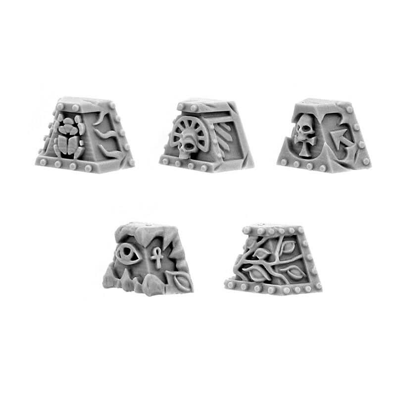 Includes five unique pyramid-themed shoulder pads, each with slight variations in the engraving and trim. Perfect for squad leaders, aspiring sorcerers, or to unify an entire unit under one esoteric symbol.